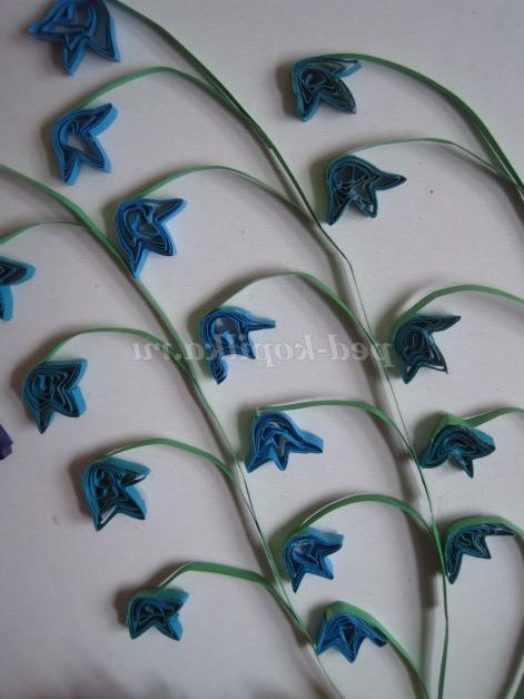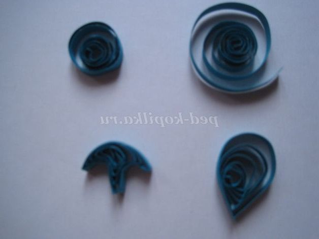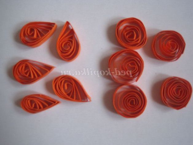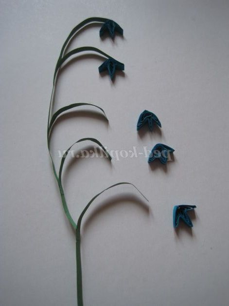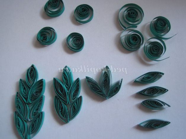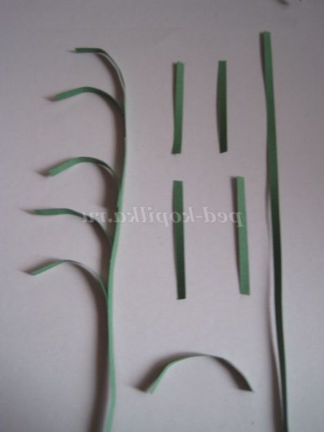 Беремо смужки для квілінгу зеленого кольору, скручуємо роли, даємо їм трохи розкрутитися, стискаємо з двох сторін пальцями. З цих заготовок збираємо листя різного розміру. Лист може складатися з однієї заготовки (листя квітів до третього виду); з трьох заготовок (листя до квітів другого виду); з п'яти, семи і дев'яти заготовок (листя квітів до першого виду).