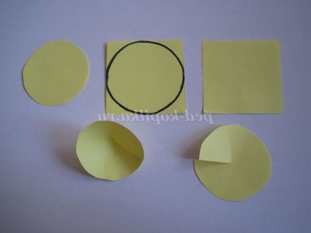 Виготовляємо основу для квітки. Вирізаємо квадрат з паперу такого ж кольору, що і пелюстки. Розмір квадрата 4см х 4см. На квадраті малюємо коло, вирізаємо його, робимо надріз до центру кола, краї надрізу накладаємо один на одного і склеюємо. Основа для квітки готова.