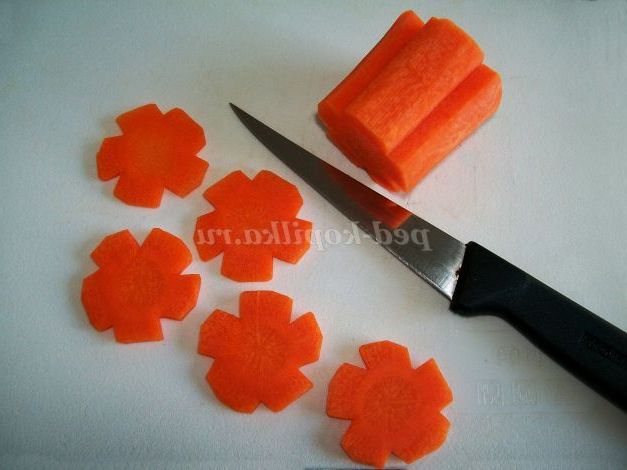 • Можна нарізати моркву квіточками. Очищену моркву треба прокарбовать. Для цього уздовж моркви прорізати борозенки (5-6 штук).