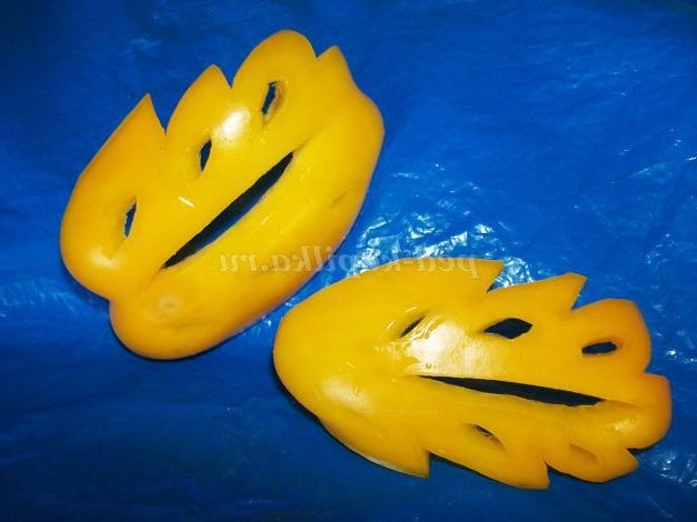 Листя можна вирізати з огірка, кабачка, баклажана. Найкрасивіші листя виходять з кольорового перцю. Підготовлений перець необхідно розрізати на чотири частини, видалити плодоніжку з насінням, промити. Отриманої заготівлі надати потрібну форму і розмір.