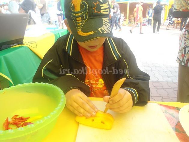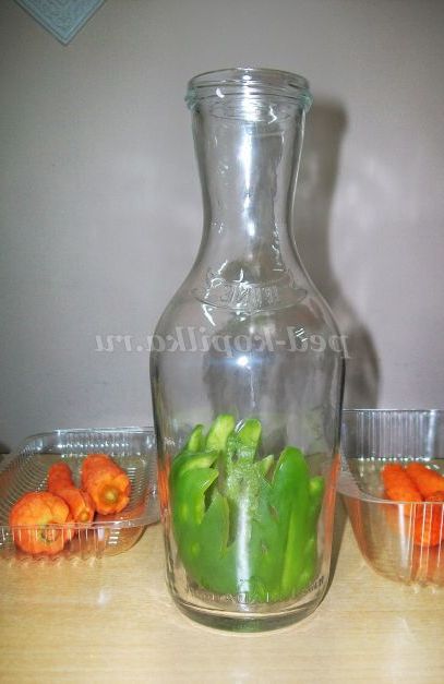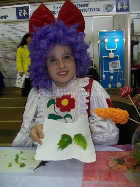 Виготовлення декоративної пляшки з овочами на перший погляд може здатися трудомістким і складним процесом. Насправді цей процес дуже захоплюючий. Вирізати прикраси з овочів не так вже й складно. У цих юних творців вийшло з першого разу.