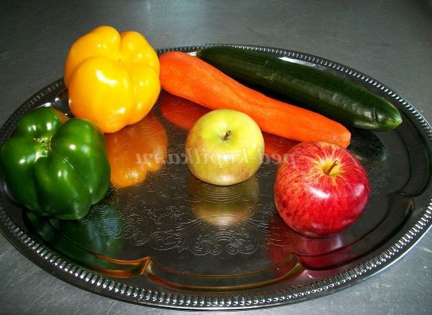 Вибираючи поєднання продуктів, слід віддавати перевагу контрастним кольорам - композиції будуть більш феєричними. Червоний, зелений, жовтий - фаворити. Овочі і фрукти необхідно ретельно вимити, видалити плодоніжки, листя, залишки гички - все зайве.