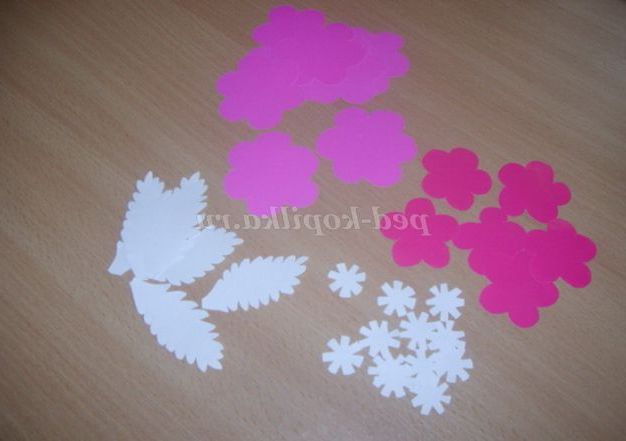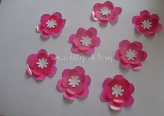 Збираємо квіточки. Ножицями акуратно загнути кожна пелюстка для обсягу. Наклеїти на велику квітку, маленька квіточка, потім наклеїти серединку.