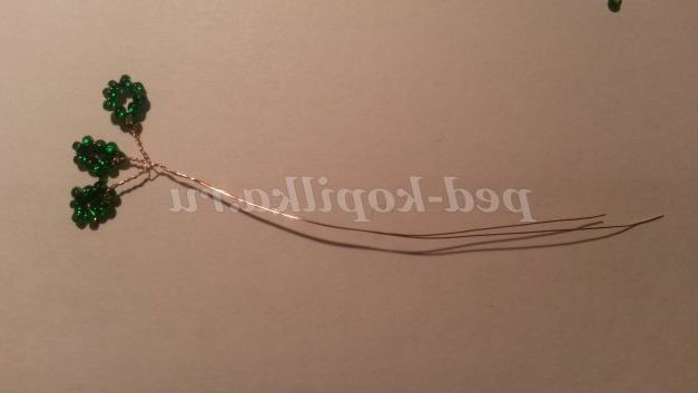 4) Основою кожної гілки буде ця ж конструкція, але з золотистого бісеру. До неї ми прикручуємо різну кількість рядів, в залежності від яруса, що складаються з 3-х голок.