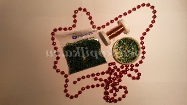 Нам знадобиться:дріт, бісер (100гр. зеленого і 50гр.золотистого), ножиці, намистинки для ялинкових іграшок, спиця.