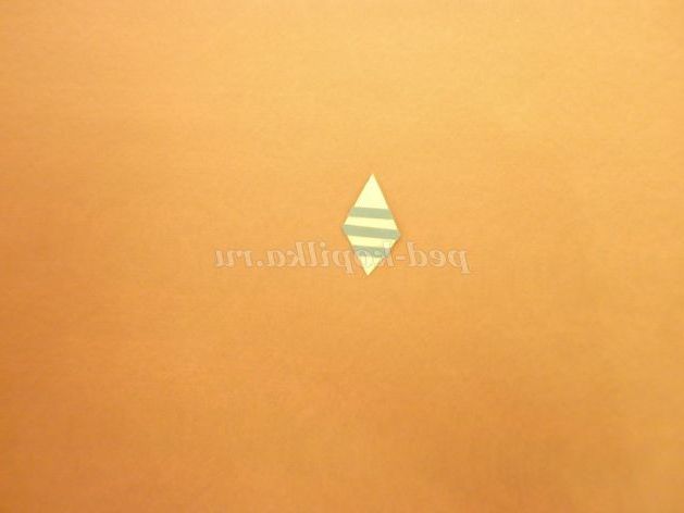 7. На картон зеленого кольору докласти шаблон тулуба і вырезать.С зворотного боку заготовки прокреслити кінчиками ножиць по лініях згину (так легше буде скласти) і склеїти піраміду.