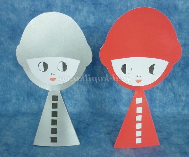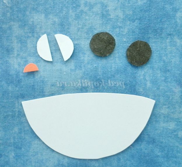 4. На одну заготовку голови приклеїти деталь особи, приклеїти кола чорного кольору, на них - напівкола білого кольору. Приклеїти маленький червоний півколо - рот. Залишилося намалювати ніс. Дві деталі голови склеїти.