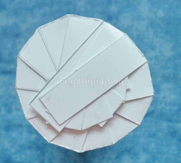 4. Склеїти циліндр - ракету. Діаметр циліндра вийде 6 див. Смужки загнути в середину і теж склеїти, накладаючи один на одного. Це буде основа для носової частини ракети.