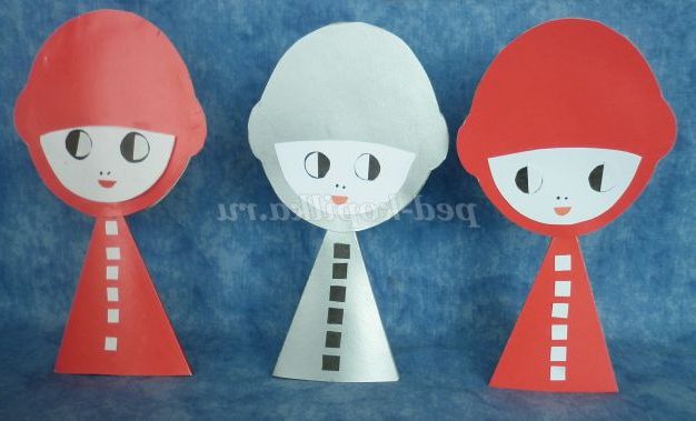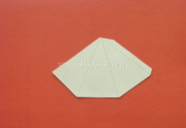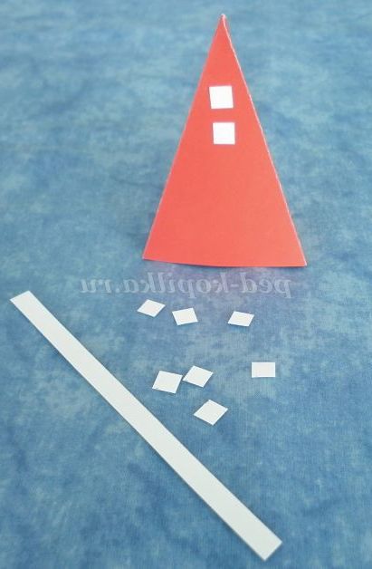 6. Склеїти піраміду. З паперу білого кольору вирізати смужку шириною 0,5 см для гудзиків. Нарізати квадратики і приклеїти на піраміду.