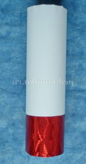 5. З червоної самоклеющейся паперу вирізати прямокутник зі сторонами, рівними 22см. і 6см. Приклеїти на готовий циліндр.