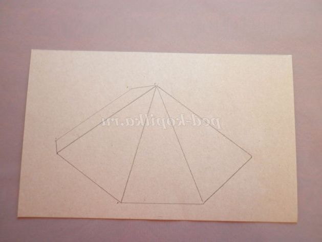 7. На картон жовтого кольору докласти шаблон тулуба і вирізати. Із зворотного боку заготовки прокреслити кінчиками ножиць по лініях згину (так легше буде скласти) і склеїти піраміду.
