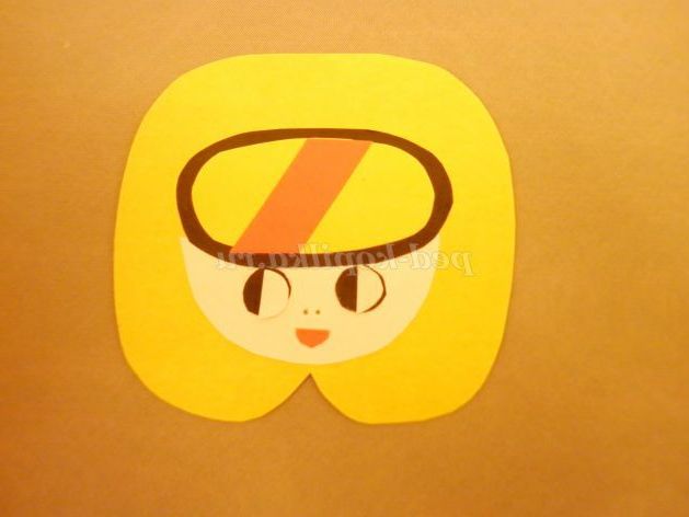 6. Оформляємо особа. Приклеїти кола чорного кольору, на них - напівкола білого кольору. Приклеїти маленький червоний півколо - рот. Залишилося намалювати ніс. Дві деталі голови склеїти.
