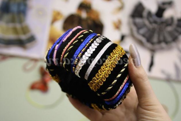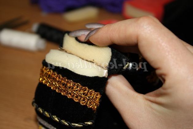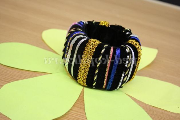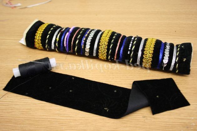 12) Коли браслет повністю прикрашений необхідно всі вузлики приховати. Для цього потрібно вирізати смужки з тканини товщиною 5 см, і пришити її до браслету з виворітного боку.