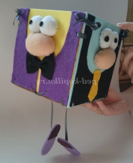 16) Вставляємо в денце стрічки з ніжками, відміряємо потрібний розмір, зав'язуємо вузлик і відрізаємо зайве. Ось такий «переодевающийся красень» у нас вийшов!
