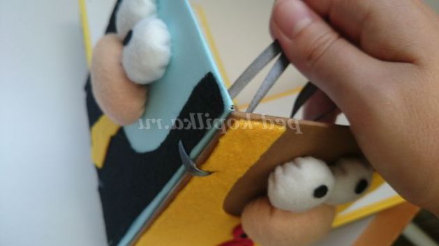 6) Носики готові. На очі можна вирізати з чорного фетру зіниці і приклеїти на клей Момент. Гудзики можна прикрасити, приклеївши смужки фетру або вручну намітати нитками. Бантик (з двох частин) 1 частина збираємо на голку посередині і пришиваємо 2 частина тоненьку смужку зверху.