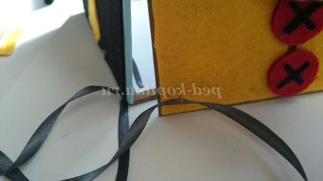 13) Відрізаємо чотири стрічки довжиною по 40см. Піднімаємо наші бічні сторони. На верхній частині по два отвори. Протягуємо в нижні отвори першу стрічку, як показано на фото.