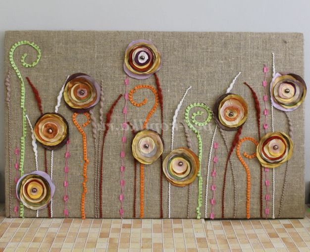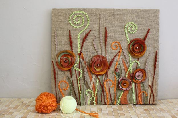 8) Далі можна наклеїти в декількох місцях (порожні місця будуть видні) ще пряжу. Розподіляємо квіти по всій поверхні панно і пришиваємо.