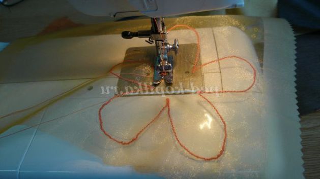 4) Тепер нам потрібна трава. Її ми будемо робити з тканини. Знадобиться швейна машинка. На тканини малюємо травинки різного розміру і проходимо по лінії малюнка швом «зигзаг».