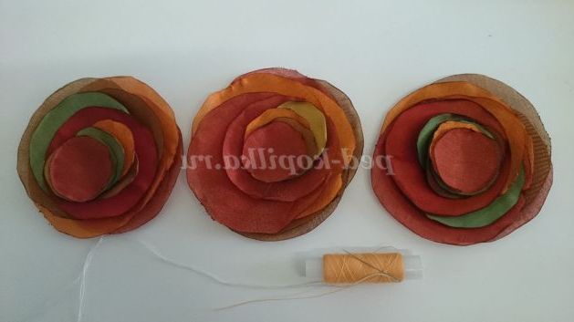 Прошиваємо краю квітки на машинці швом «зигзаг» і вирізаємо по краю. Серединку з кружечків обпалюємо свічок і збираємо в маленький квітка.