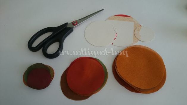 1) Для того, щоб вийшло яскраве і цікаве панно нам необхідно підготувати окремі деталі і прикраси. Спочатку вирізаємо кілька гуртків з різної тканини різного розміру (шаблон №1).