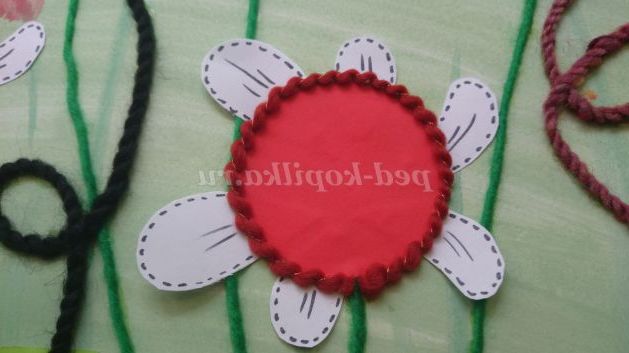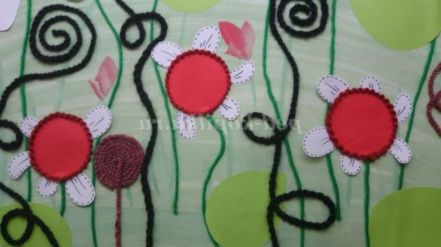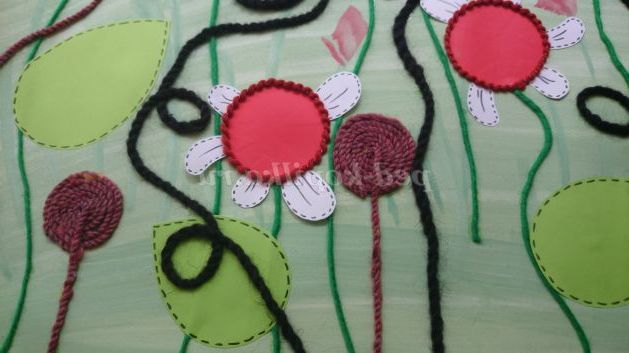 9) Можна спробувати докласти наші фотографії і подивитися, як все буде виглядати. Фото вирізаємо у вигляді гуртків і листочків. Нашим квітам не вистачає яскравості. Приклеюємо чорну і бордову пряжу на клей Момент у формі завитків.