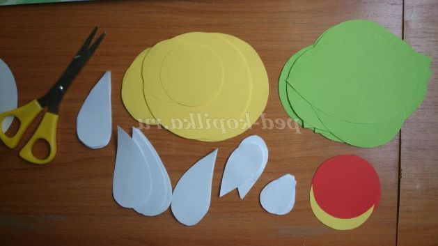 3) З тонованою папери вирізаємо деталі для квітів (7 великих жовтих кружечків, 3 маленьких червоних гуртка, 8 листочків і на кожен гурток з 5-6 білих пелюсток).