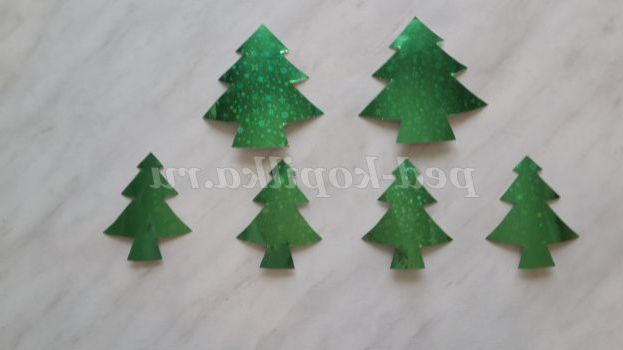 На її зворотній стороні за трафаретом обведіть простим олівцем велику ялинку - 2 деталі, і маленьку - 4 деталі і виріжте їх.