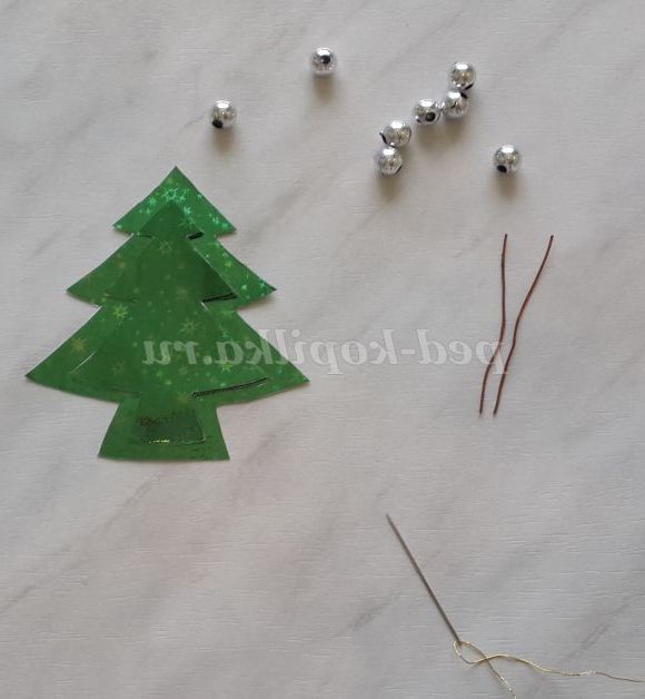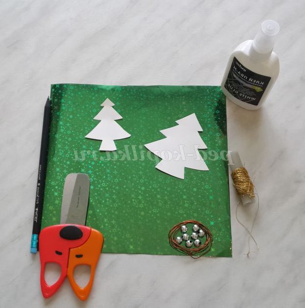 8 намистинок срібного кольору, дріт /2 шт. по 5, 5 см/, золоті нитки, голка, ножиці, клей ПВА, трафарети ялинок.