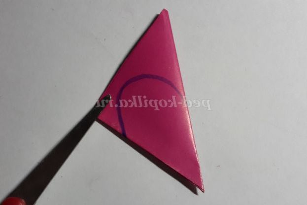 - Нам знадобиться квадрат з паперу розміром 12*12 см, який складаємо навпіл і ще раз навпіл. Одержаний квадратик складаємо по діагоналі і малюємо півколо, вирізаємо.