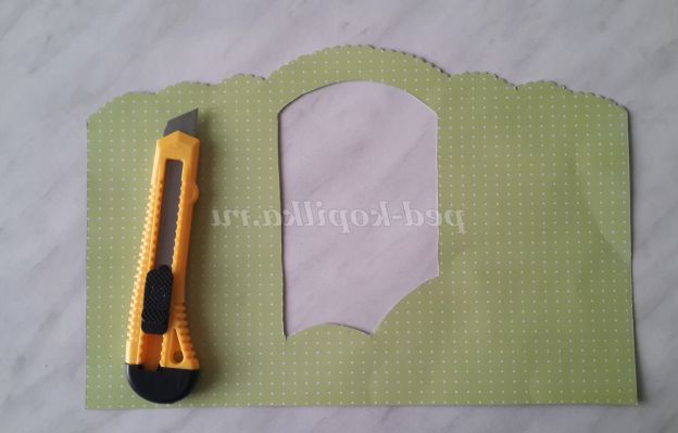 - З допомогою канцелярського ножа вирізаємо в середині листівки «віконце» за шаблоном.