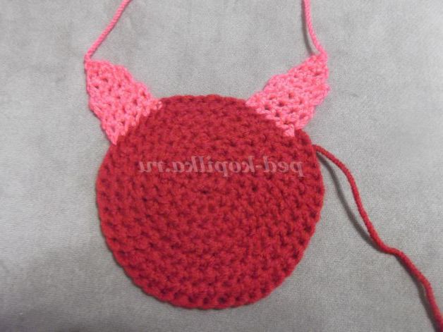 Пропустіть 6 петель у верхній частині голови і закріпіть рожеву пряжу в наступної петлі. Зв'яжіть друге вухо.