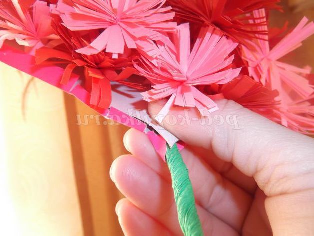 3. Вирівняйте бахрому і скрутіть порізану смужку в тугий рол. Закріпіть кінчики клеєм ПВА, потім распушите бахрому. Зробіть 35 червоних, і 35 рожевих «пухнастиків».