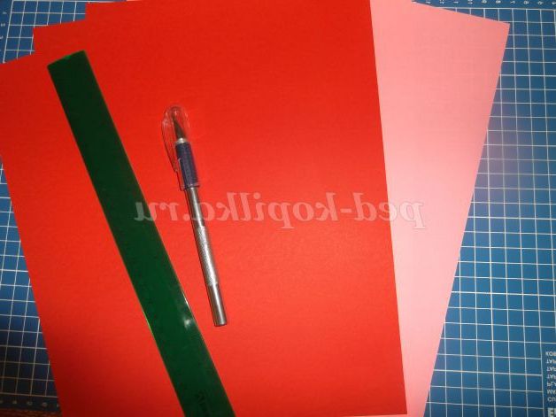 1. Спочатку приготуємо смужки для хвої нашого дерева, для цього вирізаємо червоні і рожеві смужки шириною 3 см, довжиною 30 см.
