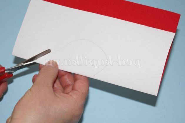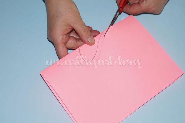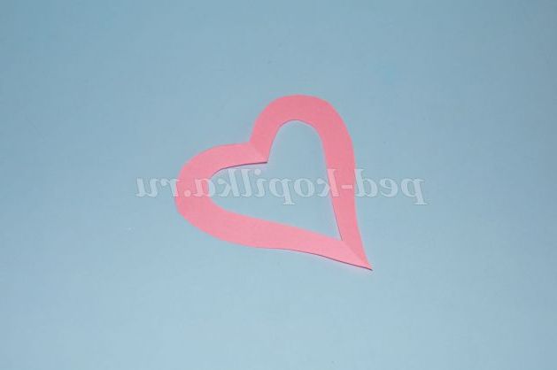 Потім згортаємо навпіл рожеву папір, малюємо трафарет половинки сердечка і вирізаємо її. Вийшло рівне однакове серце