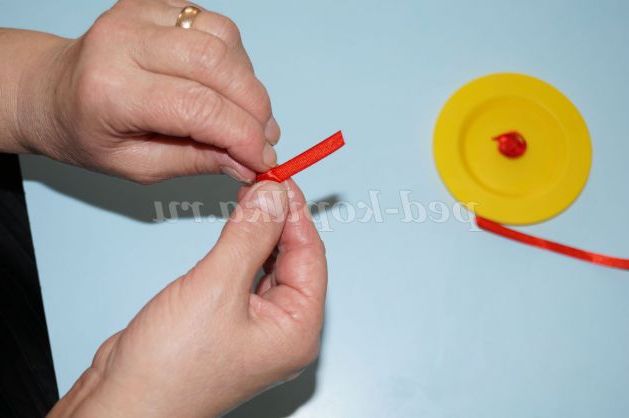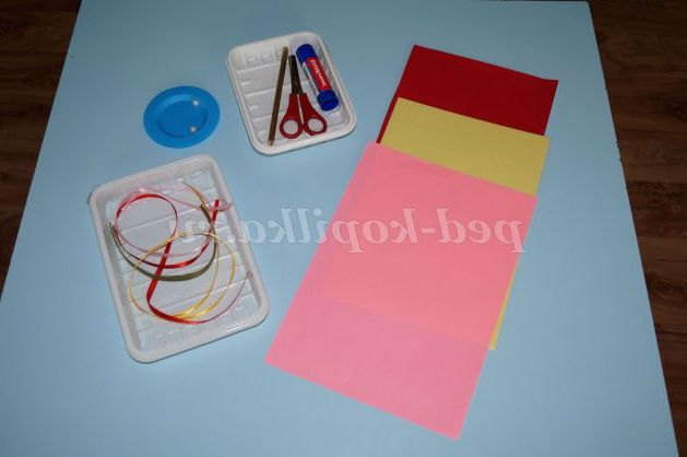 Вам буде потрібно: стрічка, атласна тасьма червоного, зеленого, блакитного і рожевого кольору, пара намистинок, оксамитова папір червоного кольору, кольоровий папір жовтого і рожевого кольору, клей, ножиці, олівець
