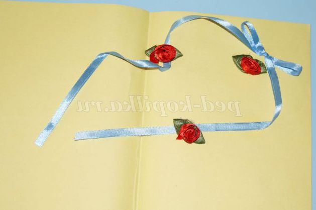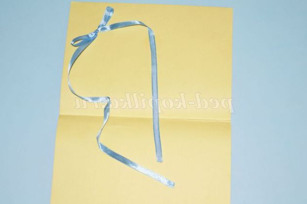Беремо блакитну атласну стрічку і зав'язуємо з неї витончений бантик. Закріплюємо бантик за допомогою клею на листівці, при цьому залишаємо витончені довгі кінчики