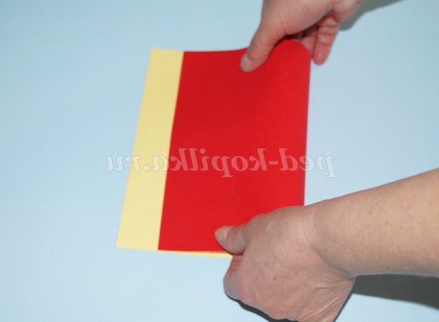 На червоний оксамитовий лист із зворотного боку наклеюємо жовту папір ( дуже акуратно поєднуємо і пропрасовуємо з двох сторін)