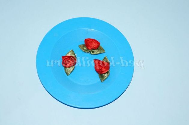Далі з червоною атласною стрічки готуємо три трояндочки з листочками. Для початку беремо червону стрічку і по спіралі скручуємо її, закріпивши кінчик клеєм