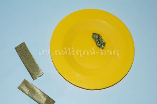 Потім із зеленої стрічки робимо листочки. Складаємо тасьму навпіл, надаючи форму листочка і закріплюємо клеєм.