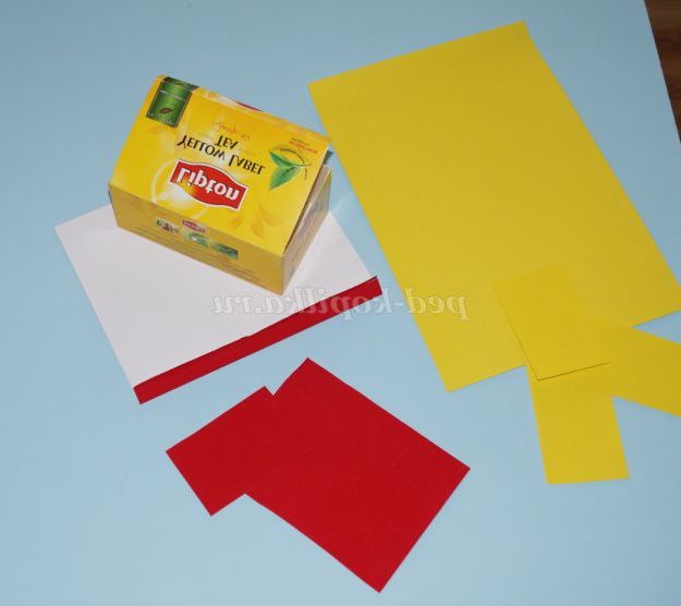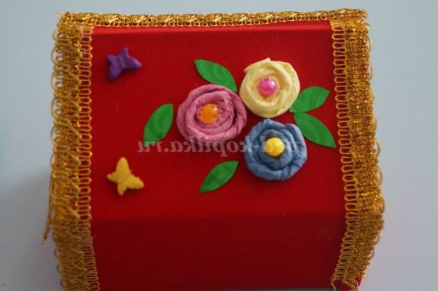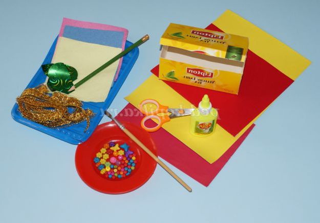 Вам буде потрібно: коробочка, оксамитова папір червоного і жовтого кольору, клей ПВА, пензлик, столові серветки рожевого, жовтого і блакитного кольору, жовта золотиста тасьма, зелена фольга, біжутерія з бус, квіточок, метеликів, простий олівець, ножиці