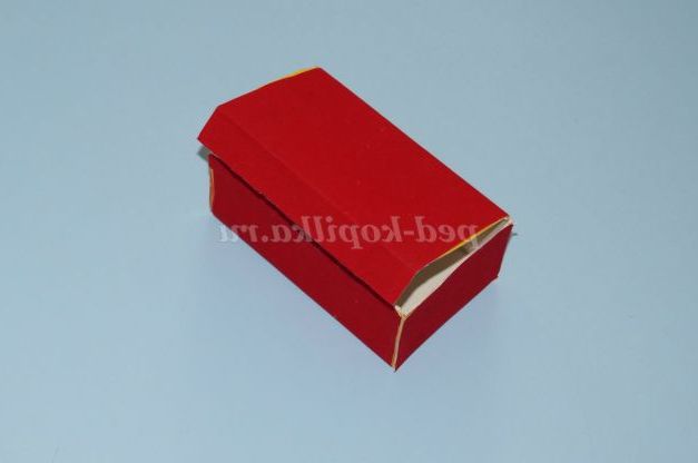 Для обклеивания коробочки з червоною оксамитовою папери за розміром, обмірів довжину і ширину, вирізаємо для низу і верху два однакових прямокутника, потім так само обмеряем бічні 2 сторони і вирізаємо