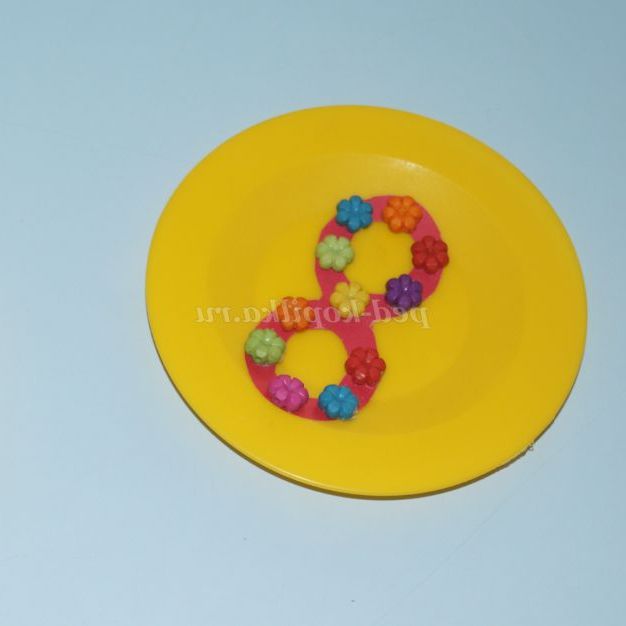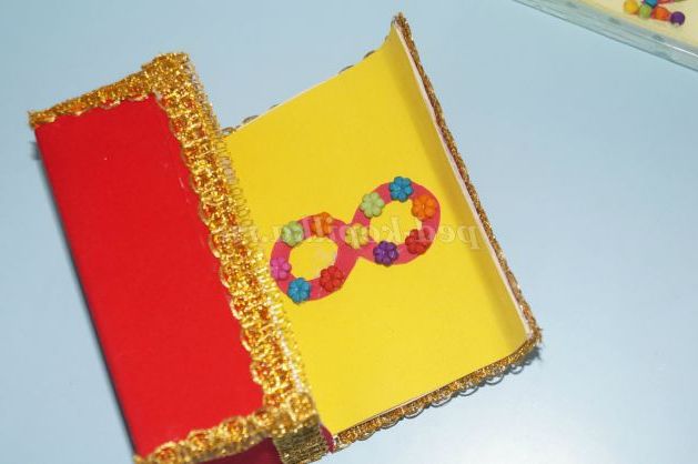 Для прикраси скриньки зсередини намалюємо на червоному папері цифру «8», вирізаємо її і прикрашаємо, за допомогою клею, квіточками з біжутерії