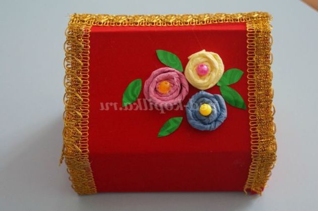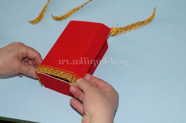 Золотистої тасьмою прикрашаємо верх коробочки, відрізаючи ножицями смужки тасьми за розміром сторін шкатулки, гарненько промазав тасьму клеєм.