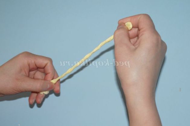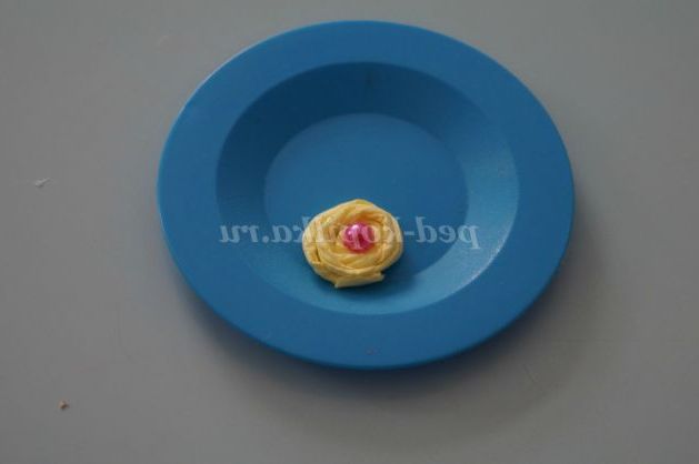 Беремо половину серветки жовтого кольору, складаємо в тоненьку трубочку і звертаємо в тонкий джгутик, а далі скручуємо по спіралі, закріплюючи кінчики за допомогою клею і на серединку приклеюємо бусинку