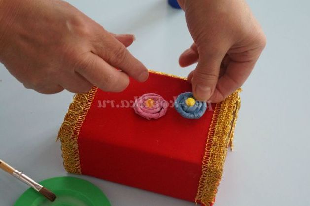 Обклеюємо коробочку вирізаними деталями за допомогою клею, наносячи пензлем на оксамитову папір зсередини, добре тримати пальчиками краю деталі