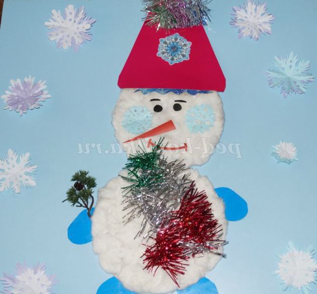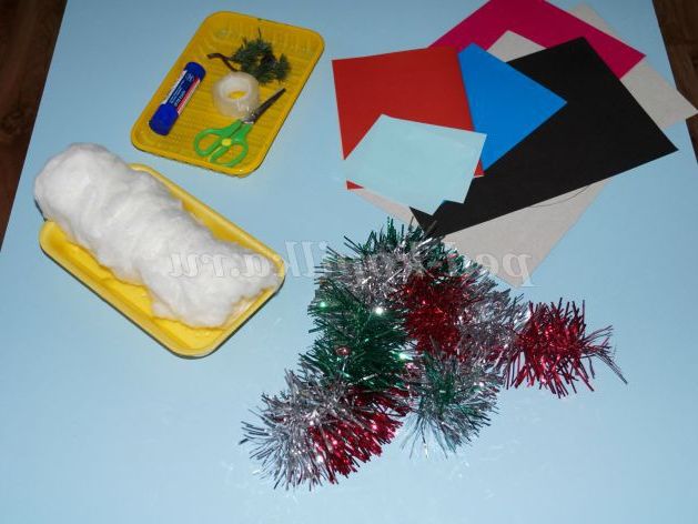 Вам буде потрібно: білий картон, вата, кольоровий папір, клей, мішура, ялинова гілочка, ножиці, сніжинки.