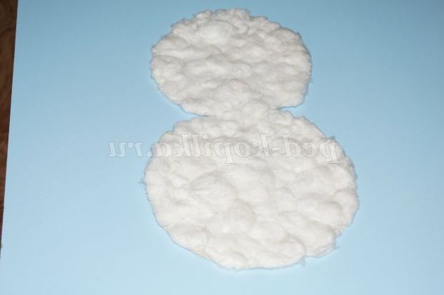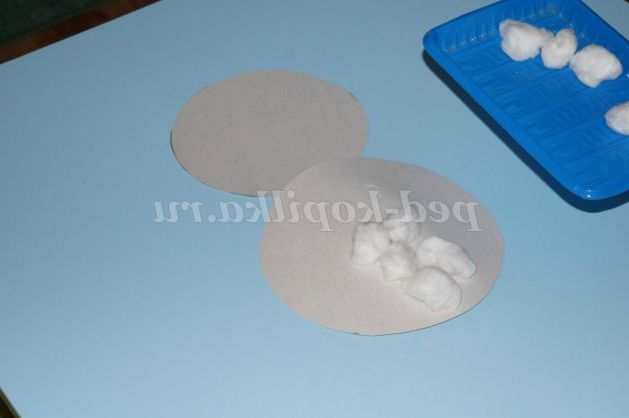 Намазуємо клеєм велике коло для тулуба сніговика, приклеюємо тісно один до одного ватні кульки