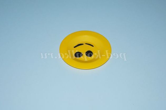 За допомогою клею приклеюємо сніговикові очі, брови, ніс-морквину і веселу посмішку, а на голову - прикрашене нами відерце