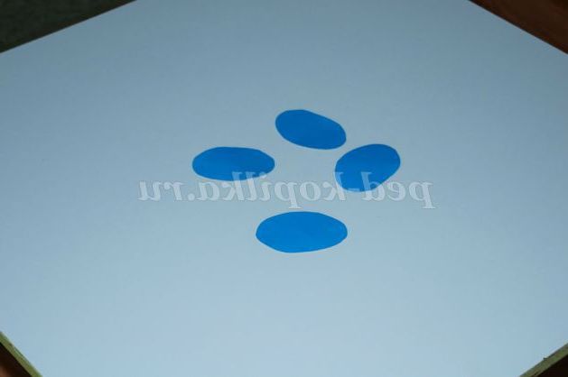Вирізаємо з блакитного картону 4 овалу - ручки і ніжки для сніговика. Приклеюємо їх до тулуба.