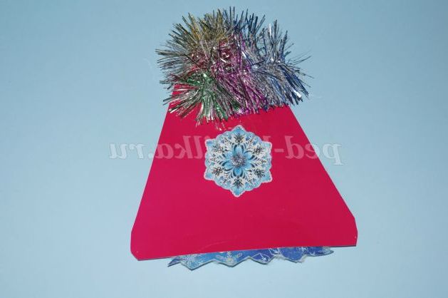 З будь-якого кольору картону вирізаємо відерце на голову сніговика, прикрасивши його сніжинкою і мішурою ( за бажанням)
